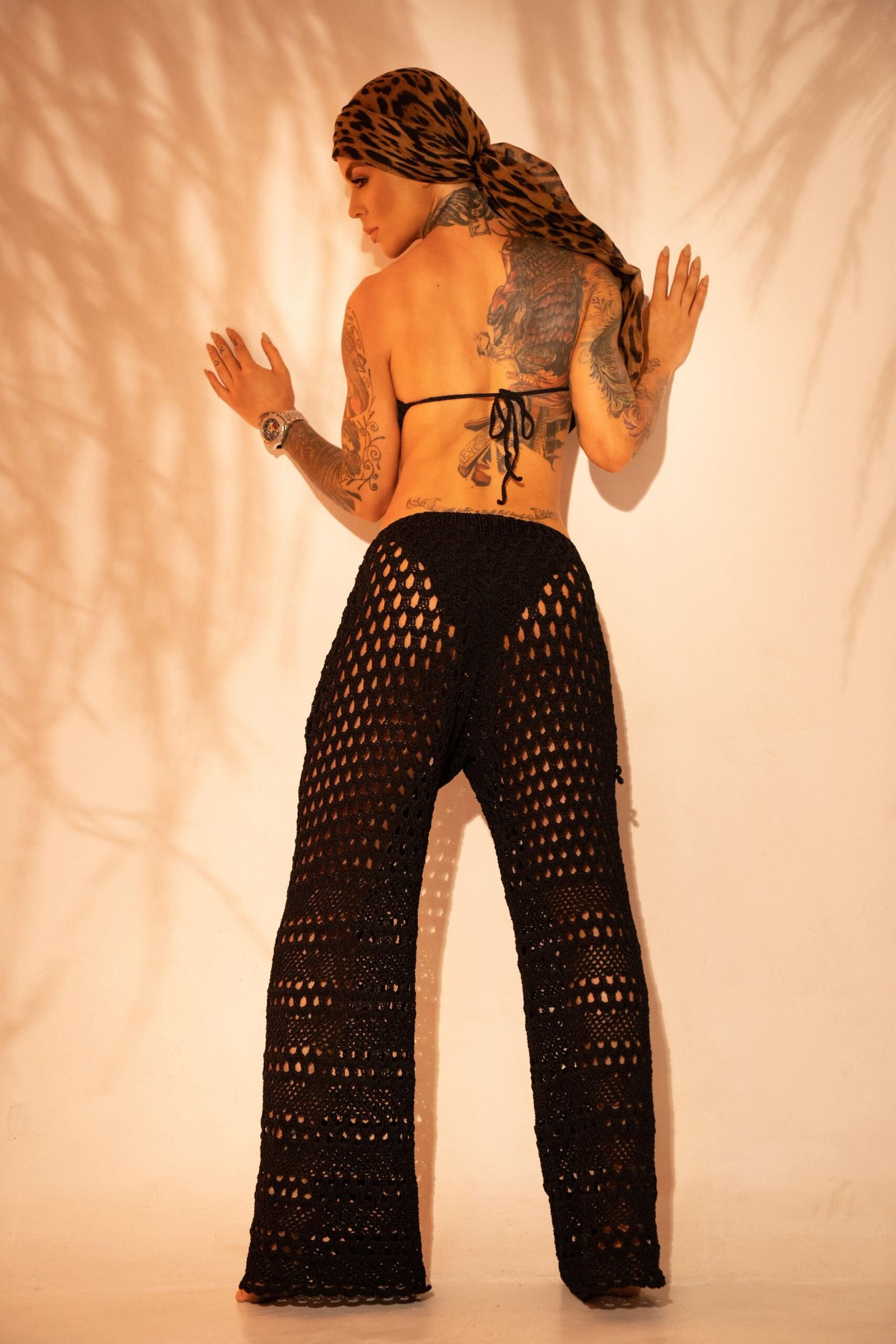 Este set de crochet en color negro combina fuerza, elegancia y libertad en una sola propuesta. Su tejido artesanal de entramado amplio permite que la piel respire y aporta un contraste perfecto entre misterio y sofisticación.